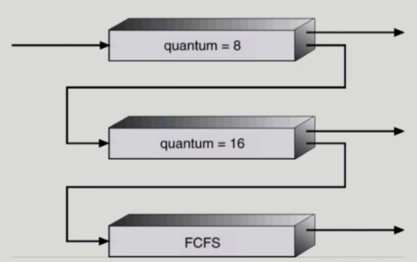 - 따라서 CPU burst가 아주 짧은 프로세스는 도착하자마자 CPU 얻어서 바로 빠져나가고 CPU 사용시간이 좀 긴 프로세스는 맨 위 큐에서 처리가 안끝나므로 우선순위가 낮은 큐로 넘어감.