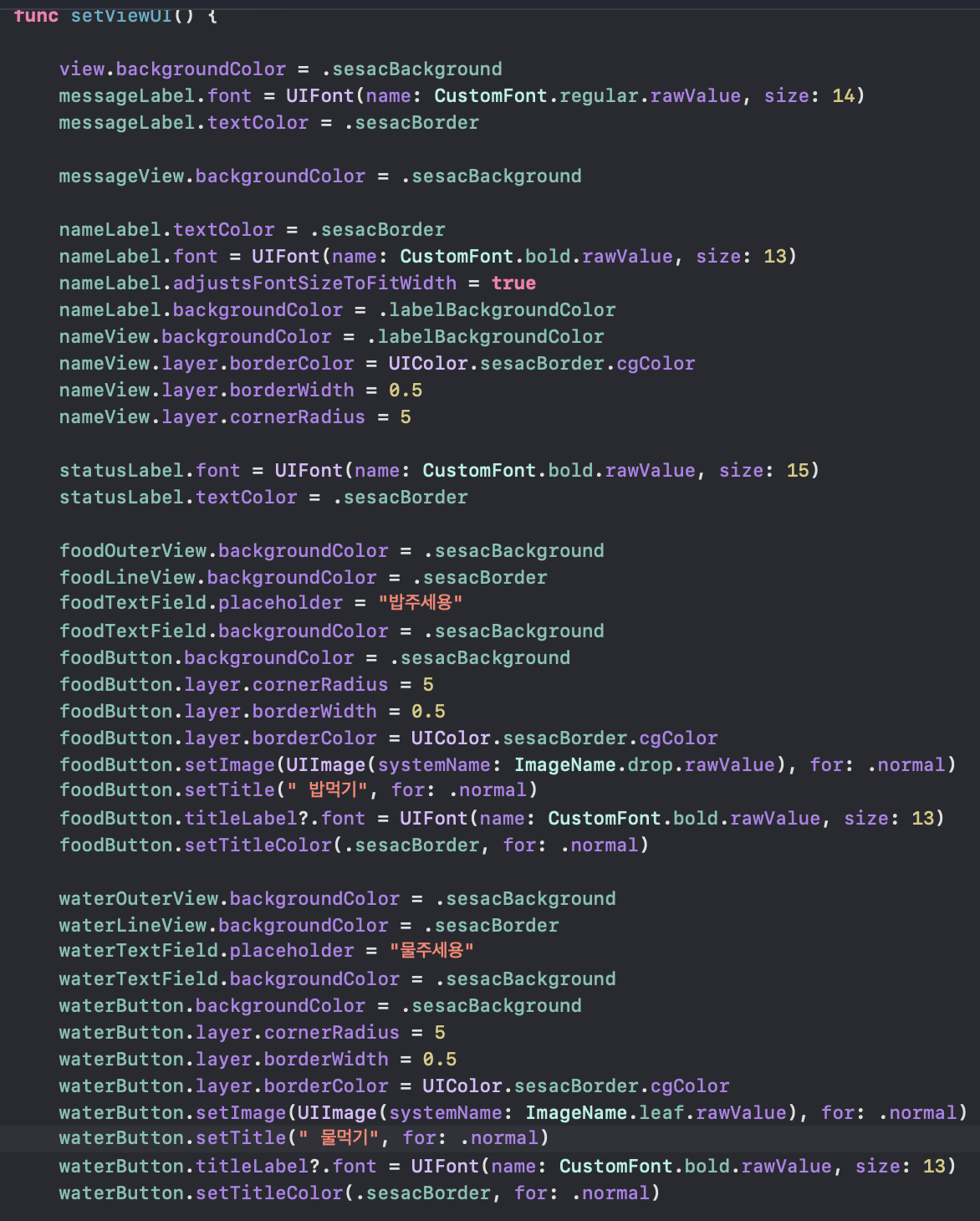 이렇게 메인뷰의 UI를 세팅하는 메서드 안에 비슷한 밥주기, 물주기 버튼 관련 코드가 반복되고있다.
