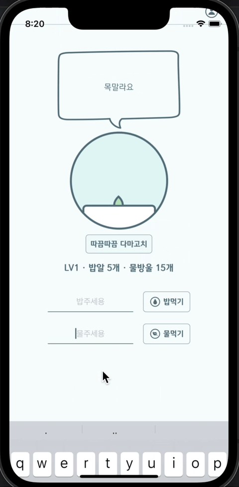 keyboardFrameEndUserInfoKey에서 리턴되는 값에서 height를 구하고 물주기 뷰의 bottomSpace를 계산해서 80정도의 여유만 갖도록 해주었다.