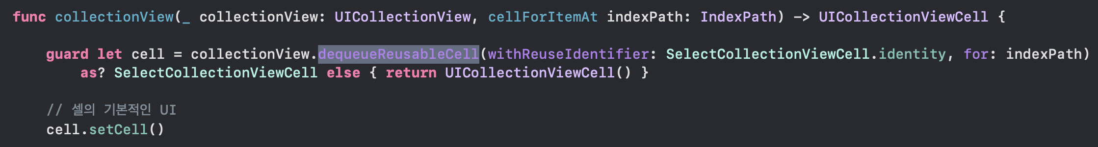 그래서 셀의 UI를 세팅하는 메서드를 cellForItemAt에서 호출한다면 재사용될때마다 셀의 UI를 세팅하는 것이다.